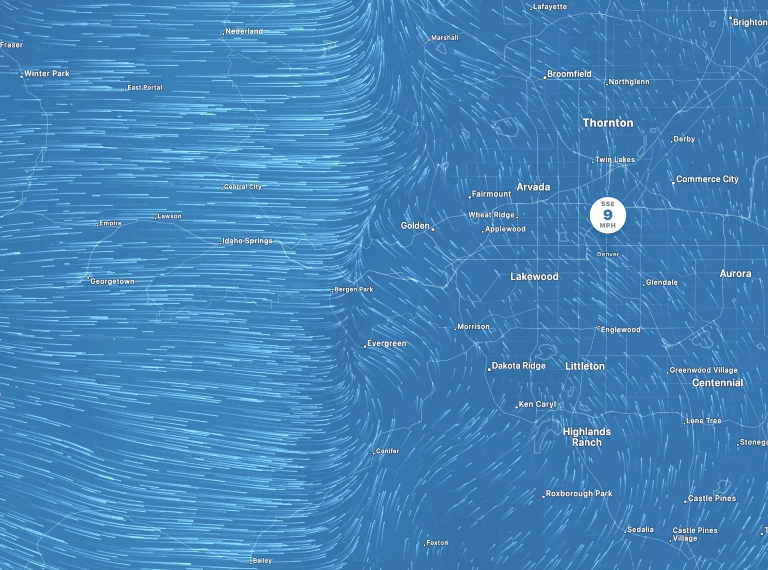 Here’s the wind pattern in the Denver, CO area. For those who don’t know, Denver sits adjacent to the Rocky Mountains making the city’s topography flat in comparison. Given that, you’ll no doubt make the connection between the wind pattern and landscape features. It’s fascinating to see how the wind screams down the mountains and effectively dies. A wall of wind.
